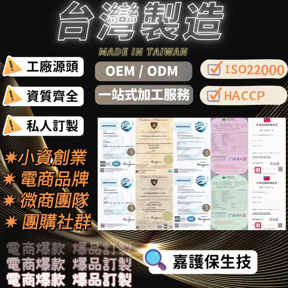 #嘉護保生技 #保健食品代工 #OEM #ODM #台灣製造#果凍代工 #膠原蛋白飲品 #酵素果凍 #粉包代工 #膠囊代工 #錠劑代工#造型袋飲品 #異型袋飲品 #水平機代工 #小資創業 #品牌貼牌